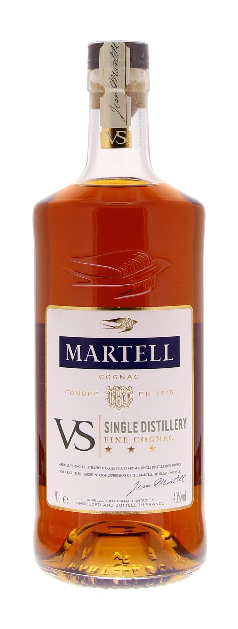 Το Martell είναι το παλαιότερο από τα μεγάλα γαλλικά σπίτια κονιάκ, που υπήρχε από το 1715. Λαμβάνοντας υπόψη την τέχνη της χειροτεχνίας, η εμπειρία δημιουργίας των καλύτερων κονιάκ μεταβιβάστηκε σε γενιές. Το Martell V.S Single Distillery είναι εξαιρετικά πλούσιο και φρουτώδες με νότες δαμάσκηνου, βερίκοκου και ζαχαρωμένου λεμονιού και υπογραμμίζει περαιτέρω τη φινέτσα του στιλ απόσταξης.